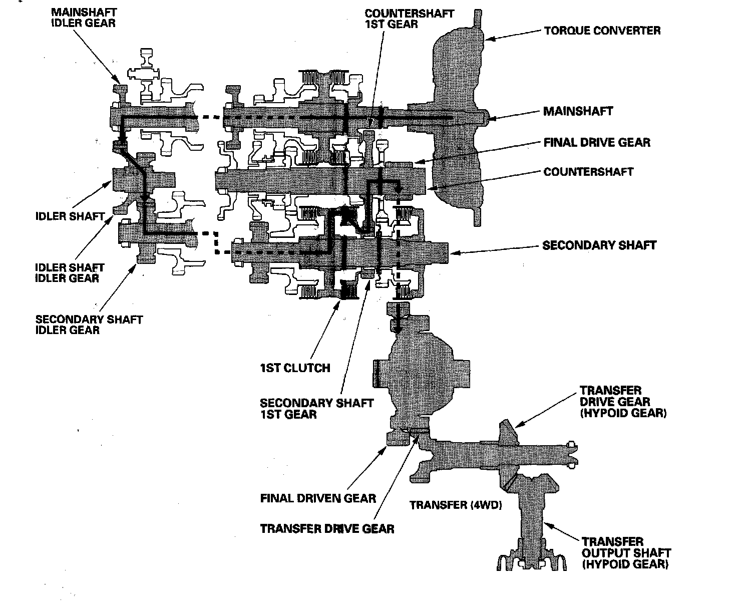^ Hydraulic pressure is applied to the 1st clutch, then the 1st clutch engages the secondary shaft 1st gear with the secondary shaft.