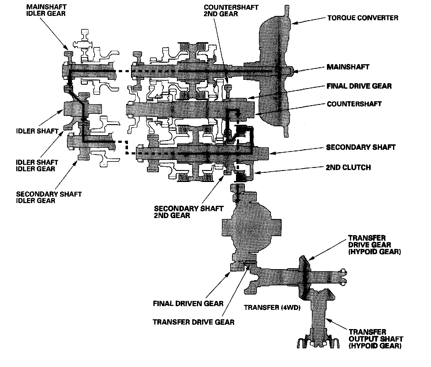 ^ Hydraulic pressure is applied to the 2nd clutch, then the 2nd clutch engages the secondary shaft 2nd gear with the secondary shaft.