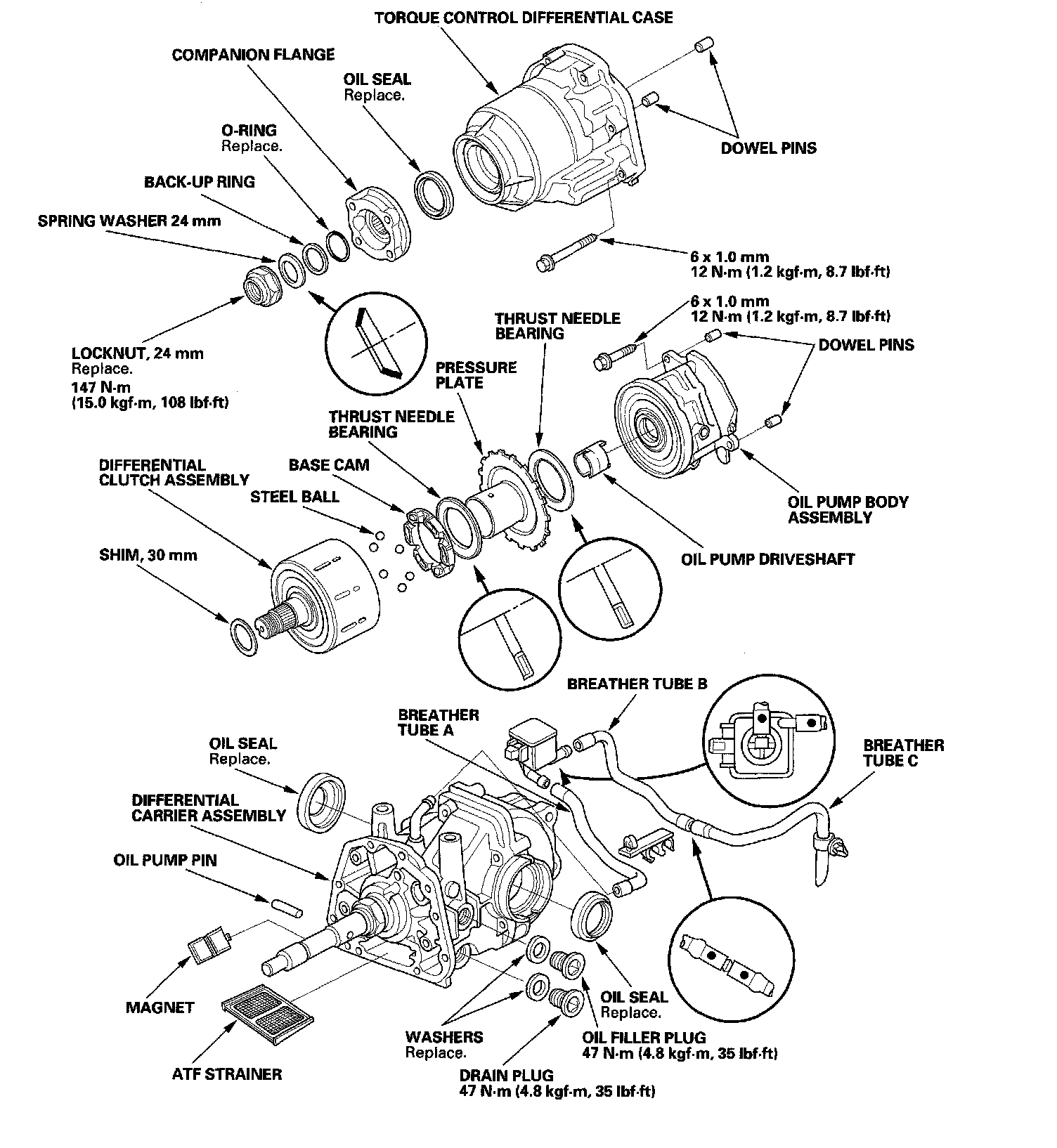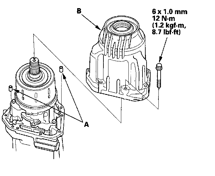 9. Install the 6 x 1.0 mm dowel pins (A) and the torque control differential case (B). Torque the eight mounting bolts in a crisscross pattern in several steps.