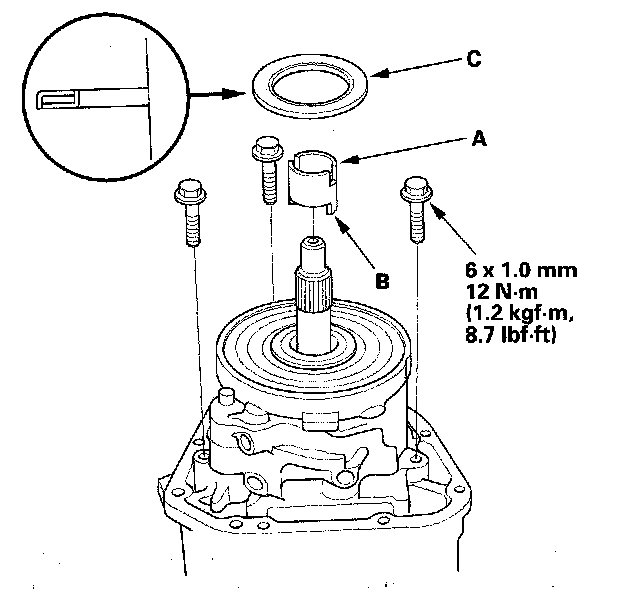 5. Align the tab (A) of the pressure plate with the groove (B) of the oil pump drive shaft, then install the pressure plate (C) on the oil pump assembly.