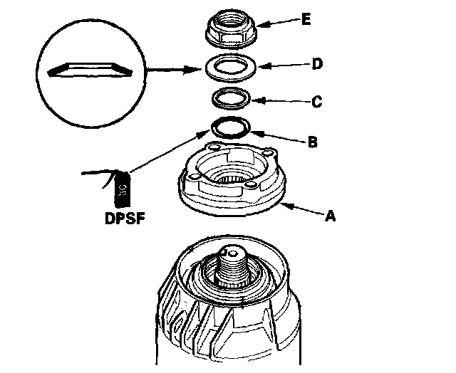 10. Install the companion flange (A), the O-ring (B), the back-up ring, (C), the disc spring washer (D), and the locknut (E).