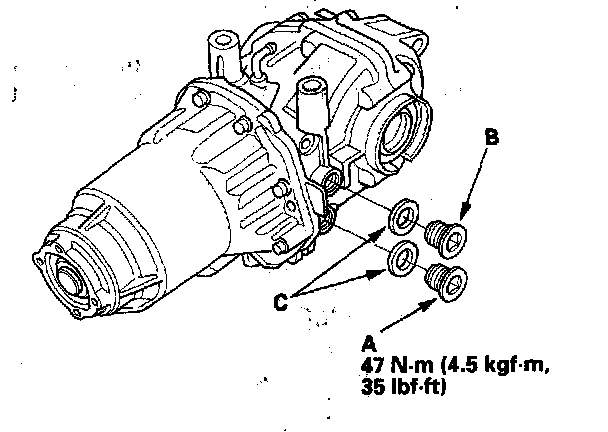 13. Install the drain plug (A) and the oil filler plug (B) with new washers (C).