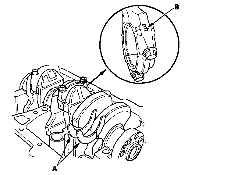 10. Seat the rod journals into connecting rod No. 1 and connecting rod No. 4. Line up the mark (B) on the connecting rod and cap, then install the caps and bolts finger-tight.