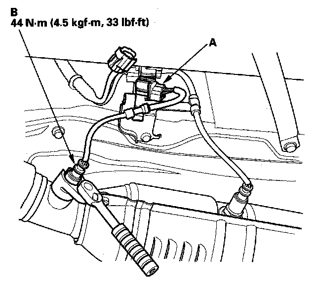1. Disconnect the A/F sensor 4P connector (A), then remove the A/F sensor (B).