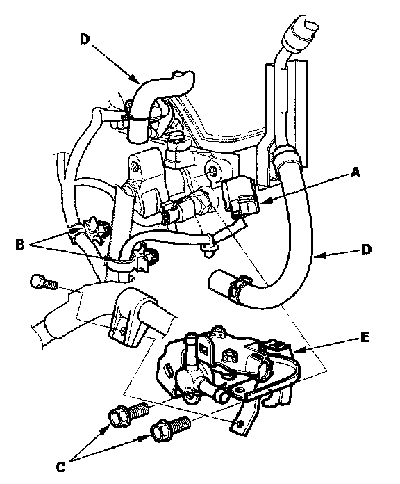 2. Remove the harness clips (B), the bolts (C), and the hoses (D), then remove the EVAP canister purge valve assembly (E).