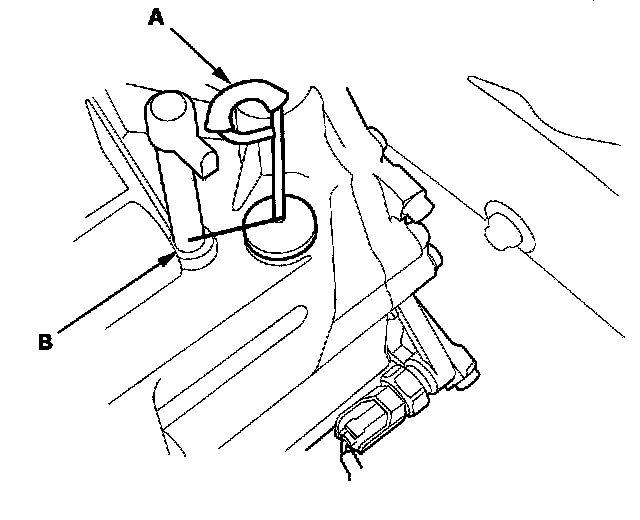 6. Insert the dipstick (A) back into the transmission with the handle pointing toward the breather pipe (B).