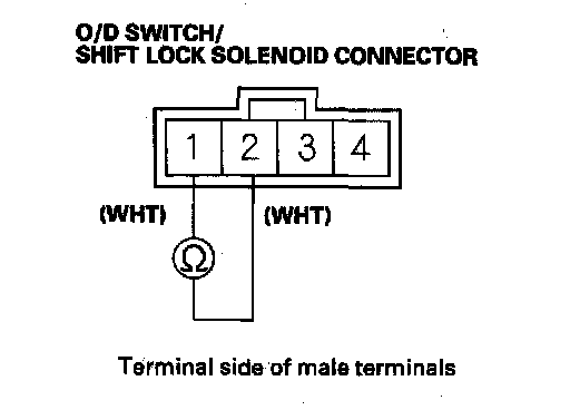 3. Check for continuity between O/D switch/shift lock solenoid terminals No. 1 and No. 2 while pressing the O/D switch and when the switch is released.