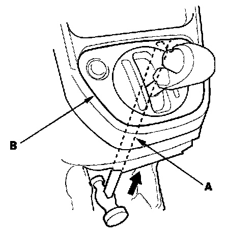 3. Using the handle end of a hammer (A), carefully insert the handle through the center lower cover opening, and push on the back side of the shift lever trim (B) to start to release the clips.