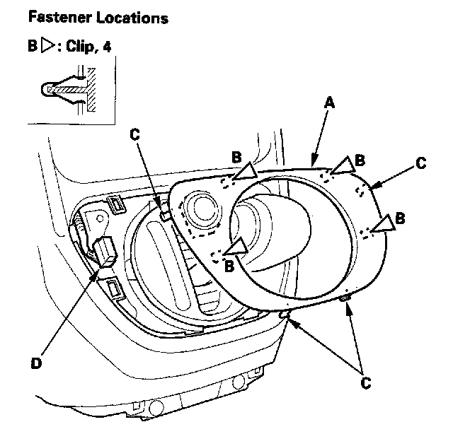 4. Pull out the shift lever trim (A) to release the remaining clips (B), hooks (C), and disconnect hazard warning switch connector (D).