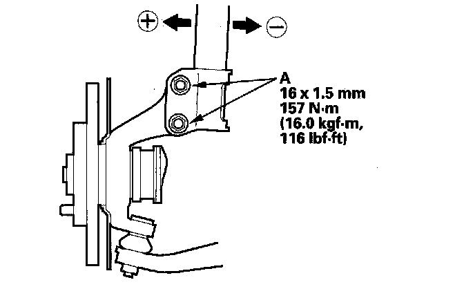 2. Loosen the flange nuts (A) and bolts, and adjust the camber by moving the bottom of the damper within the range of the damper pinch bolt free play. Tighten the flange nuts to the specified torque value.