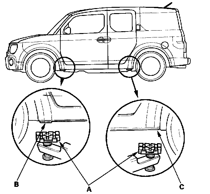 1. Position the hoist lift blocks (A) under the vehicle's front support points (B) and rear support points (C).