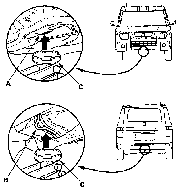 3. Position the floor jack under the front jacking bracket (A) or rear jacking bracket (B). Center the jacking bracket in the jack lift platform (C), and jack up the vehicle high enough to fit the safety stands under it.