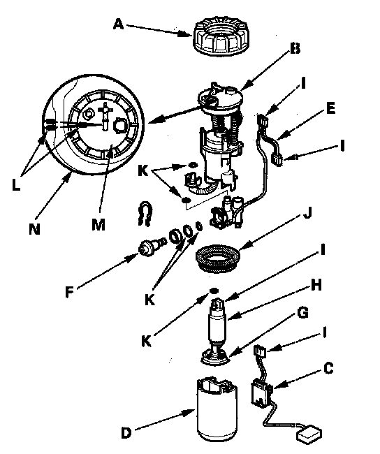 11. Install the parts in the reverse order of removal with a new base gasket (J), new locknut (A), and new O-rings (K). When installing the fuel tank unit, align the marks (L) on the unit (M) and the fuel tank (N).