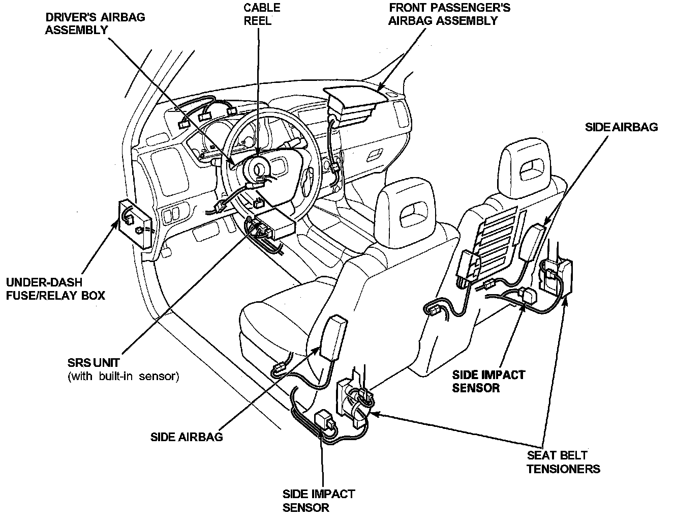 Supplemental Restraint System (SRS)This model has an SRS which includes a driver's airbag in the steering wheel hub, a passenger's airbag in the dashboard above the glove box, seat belt tensioners in the front seat belt retractors, and side airbags in the front seat-backs. The SRS unit is separate from the airbag assembly and has built-in sensors. The following precautions should be observed when performing sheet metal work, paint work, and repair work around the locations of the SRS components.
