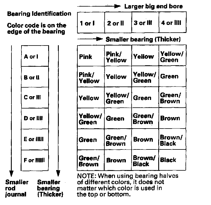 Numbers or bars have been stamped on the side of each connecting rod as a code for the size of the big end. Use them, and the letters or bars stamped on the crank (codes for rod journal size), to choose the correct bearings. If the codes are indecipherable because of an accumulation of dirt and dust, do not scrub them with a wire brush or scraper. Clean them only with solvent or detergent.