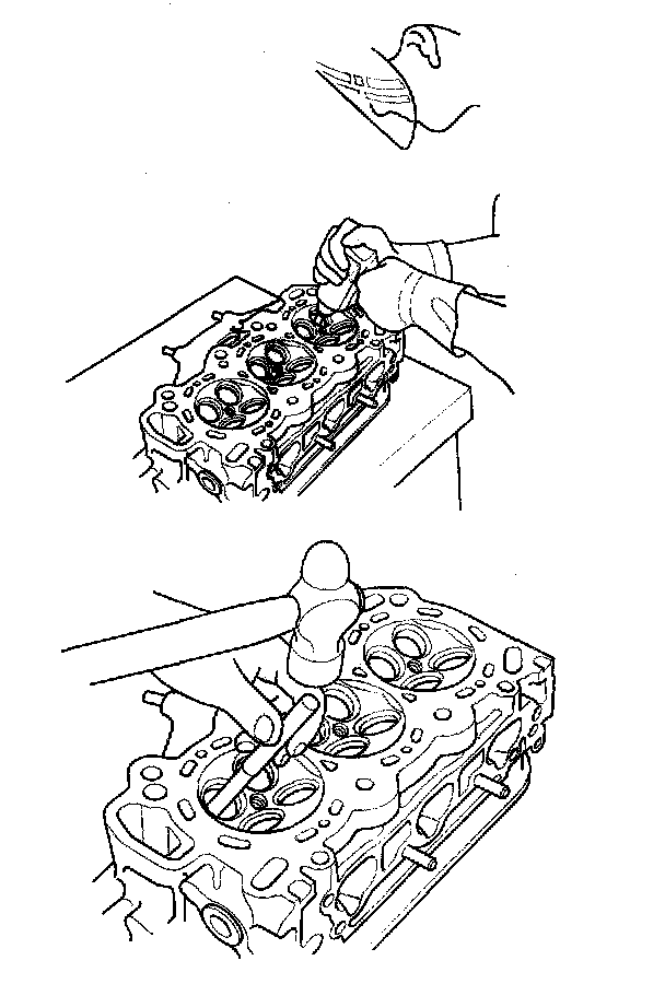 6. Turn the head over, and drive the guide out toward the camshaft side of the head.