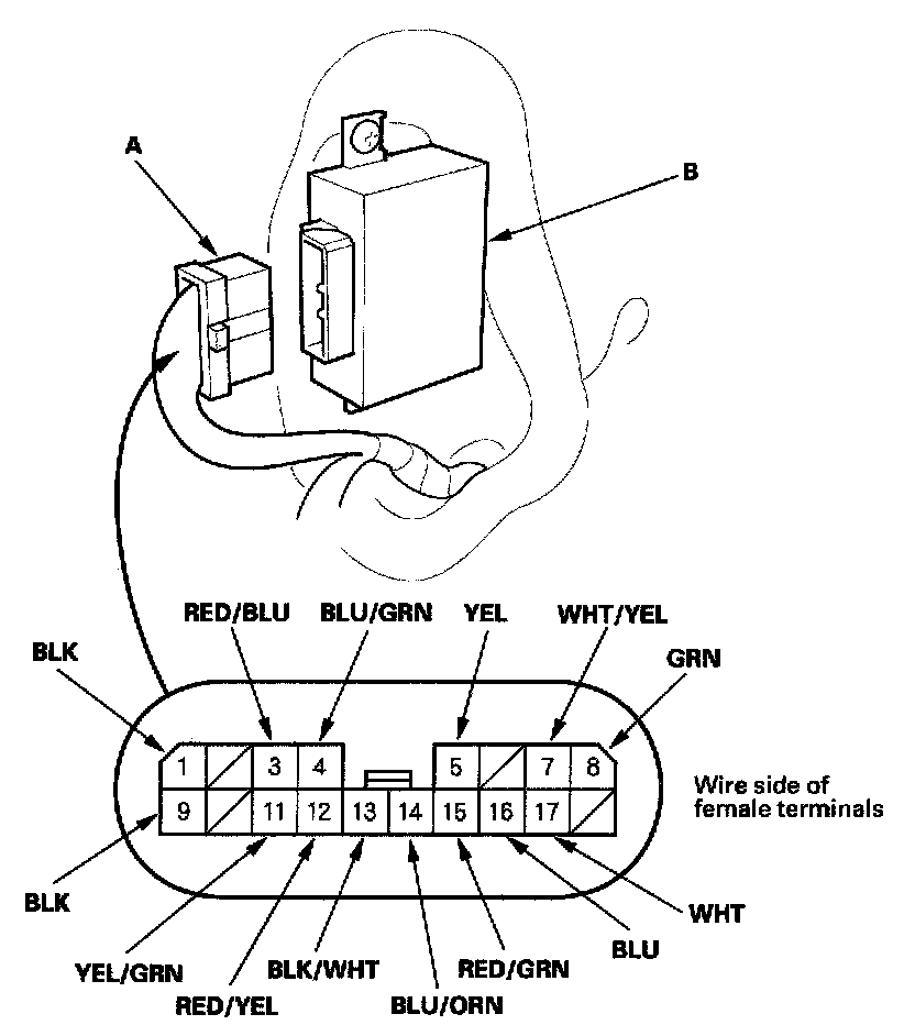 2. Disconnect the 18P connector (A) from the power window control unit (B).