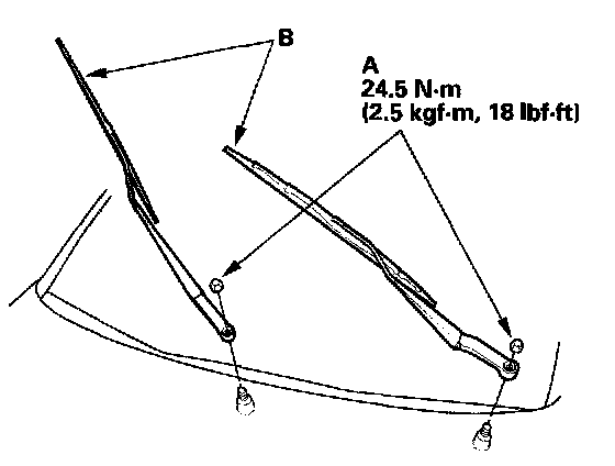 1. Remove the nuts (A) and the windshield wiper arms (B).