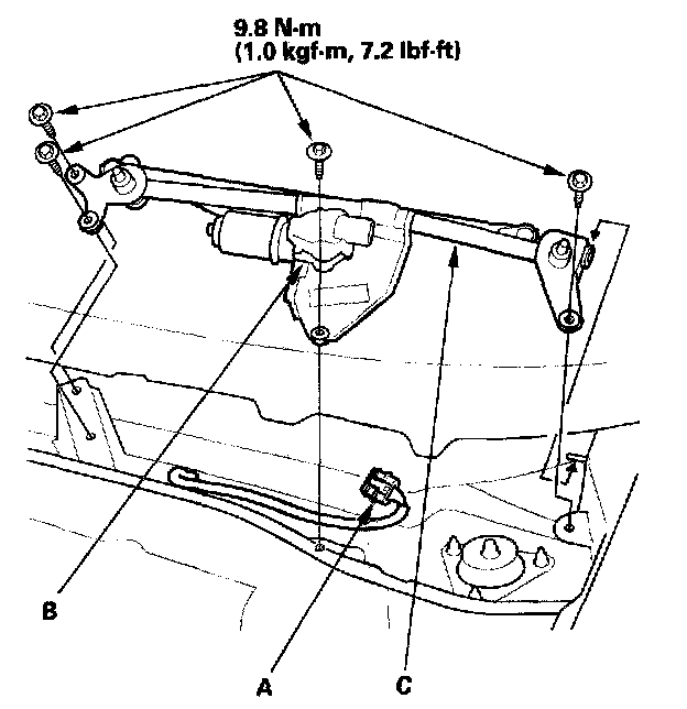 4. Remove the mounting bolts and the wiper linkage assembly (C).