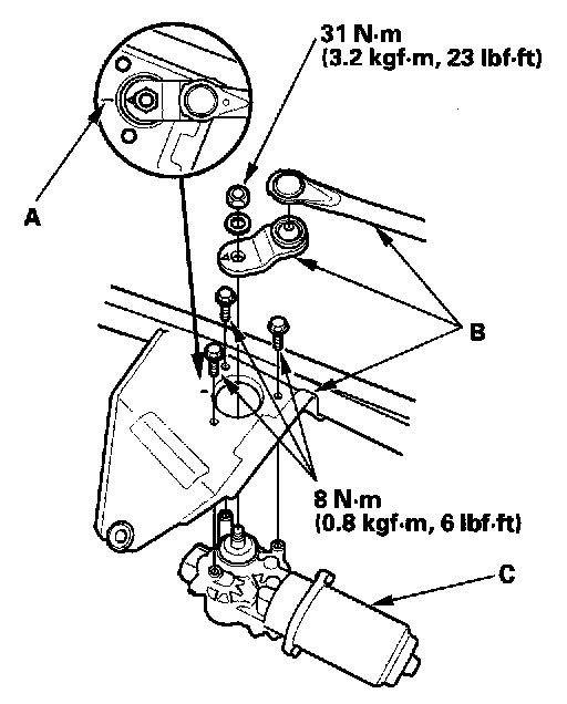 5. Scribe a line (A) across the link and windshield wiper linkage to show the original adjustment. Separate the windshield wiper linkage (B) from the wiper motor (C).
