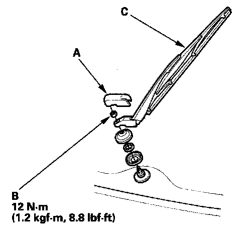 1. Remove the cover (A), mounting nut (B) and rear window wiper arm (C).