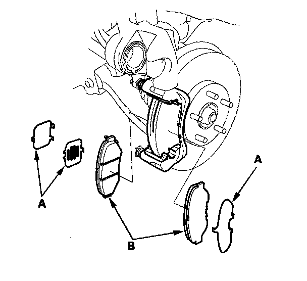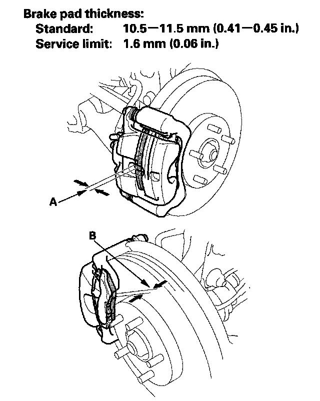 2. Check the thickness of the inner brake pad (A) and outer brake pad (B). Do not include the thickness of the backing plate.