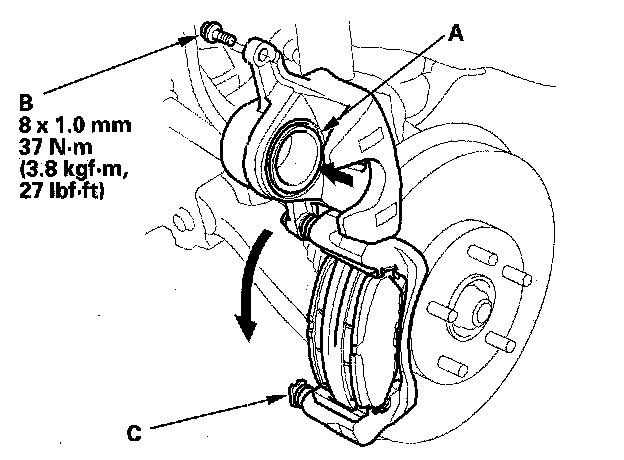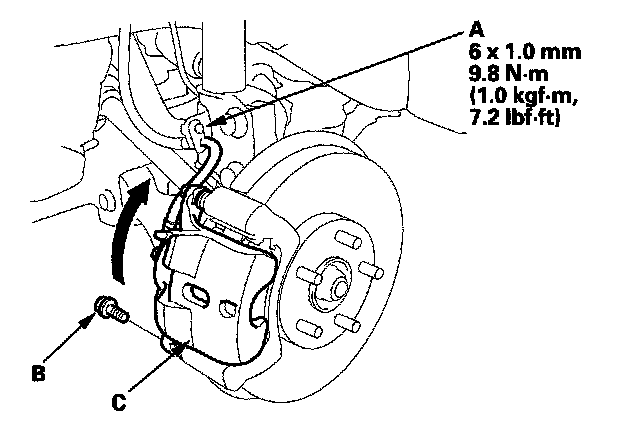 3. Remove the flange bolt (B) while holding the lower caliper pin with a wrench being careful not to damage the pin boot, and pivot the caliper (C) up out of the way. Check the hose and pin boots for damage and deterioration.