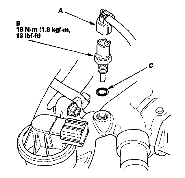 5. Install the sensor in the reverse order of removal with a new O-ring (C), then refill the radiator with engine coolant, and bleed air from the cooling system with the heater valve open.