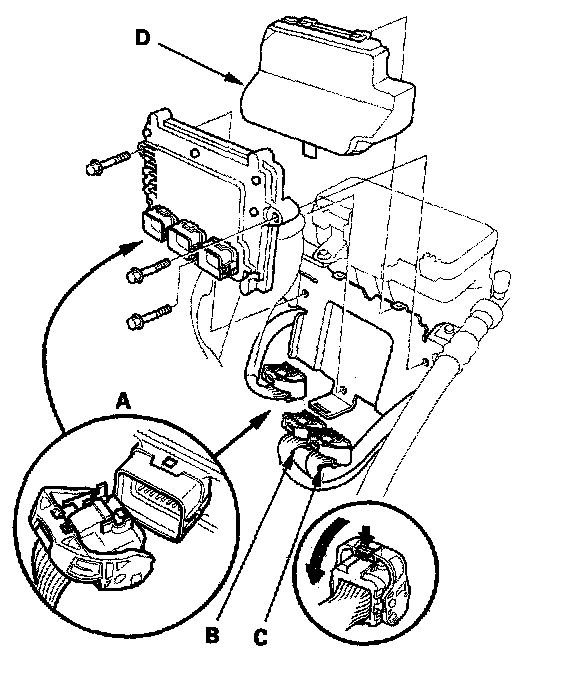 3. Remove the PCM cover (D), and disconnect PCM connectors.