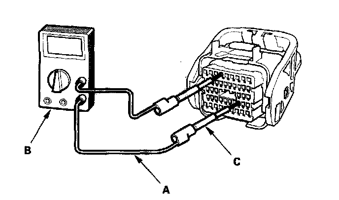 5. Connect one side of the patch cord (A) terminal to a digital multimeter (B), and connect the other side of the patch cord terminals to the pin probe (C).