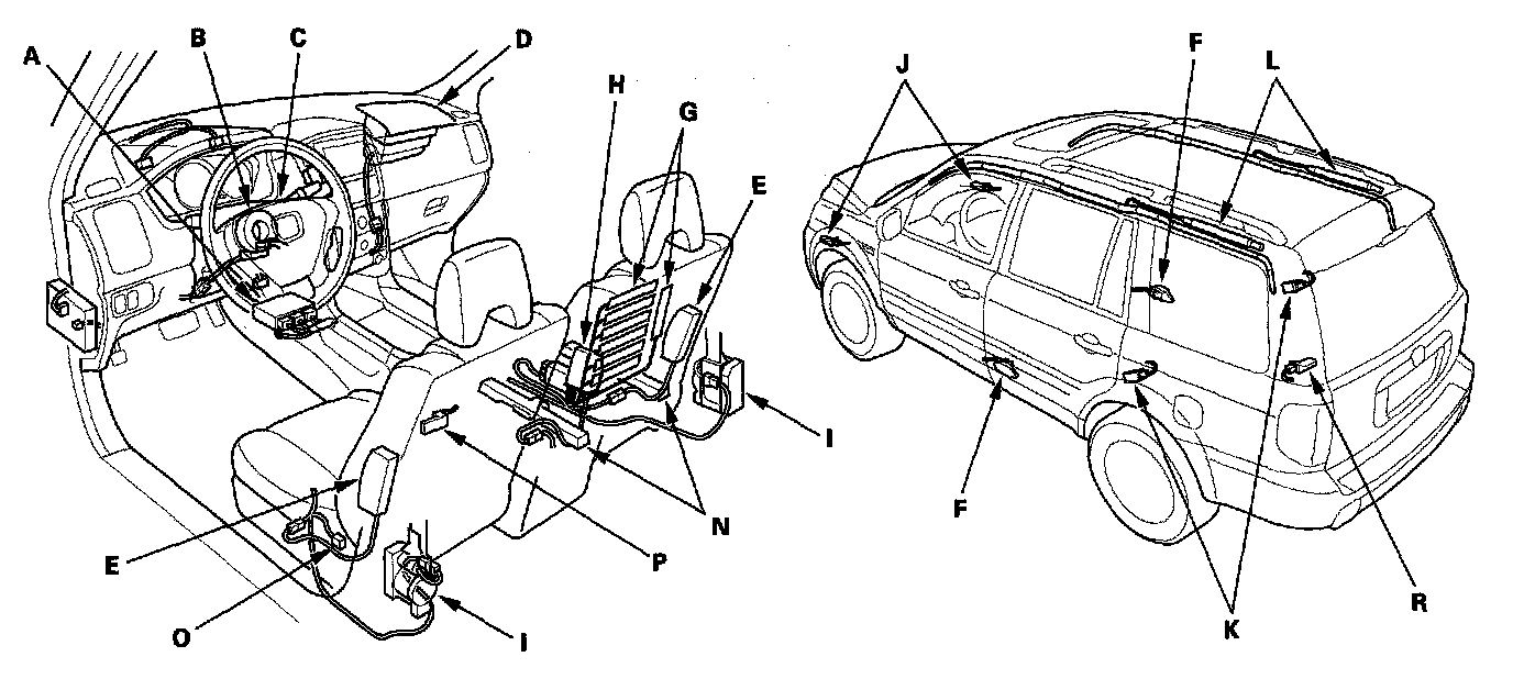 The SRS is a safety device which, when used with the seat belt, is designed to help protect the driver and front passenger in a frontal impact exceeding a certain set limit. The system consists of the SRS unit, including safing sensor and impact sensor (A), the cable reel (B), the driver's airbag (C), the front passenger's airbag (D), side airbags (E), side curtain airbags (L), seat belt tensioners (I), front impact sensors (J), side impact sensors (first) (F), side impact sensors (second) (K), roll rate sensor (P), and rear safing sensor (R).