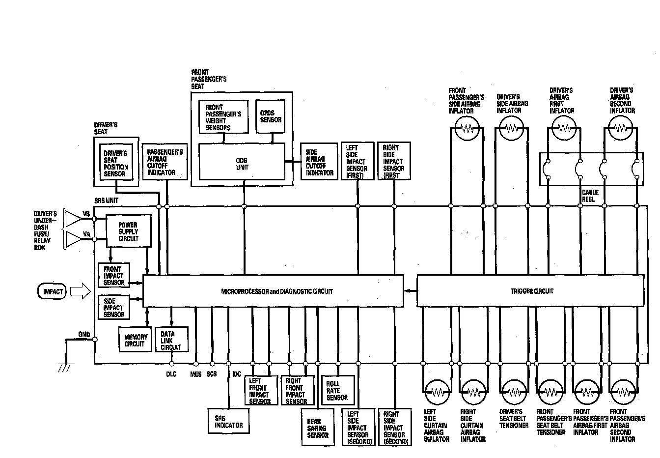 The main circuit in the SRS unit senses and judges the force of impact and, if necessary, ignites the inflator charges. If battery voltage is too low or power is disconnected due to the impact, the voltage regulator and the back-up power circuit will keep voltage at a constant level.