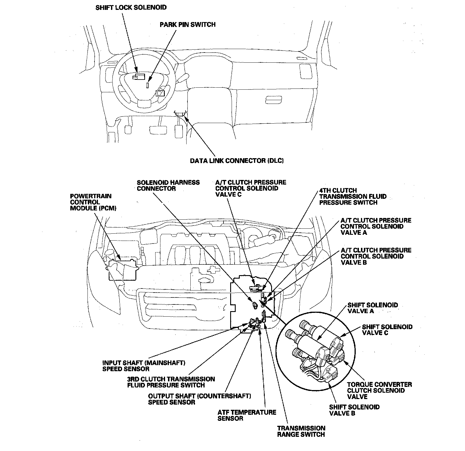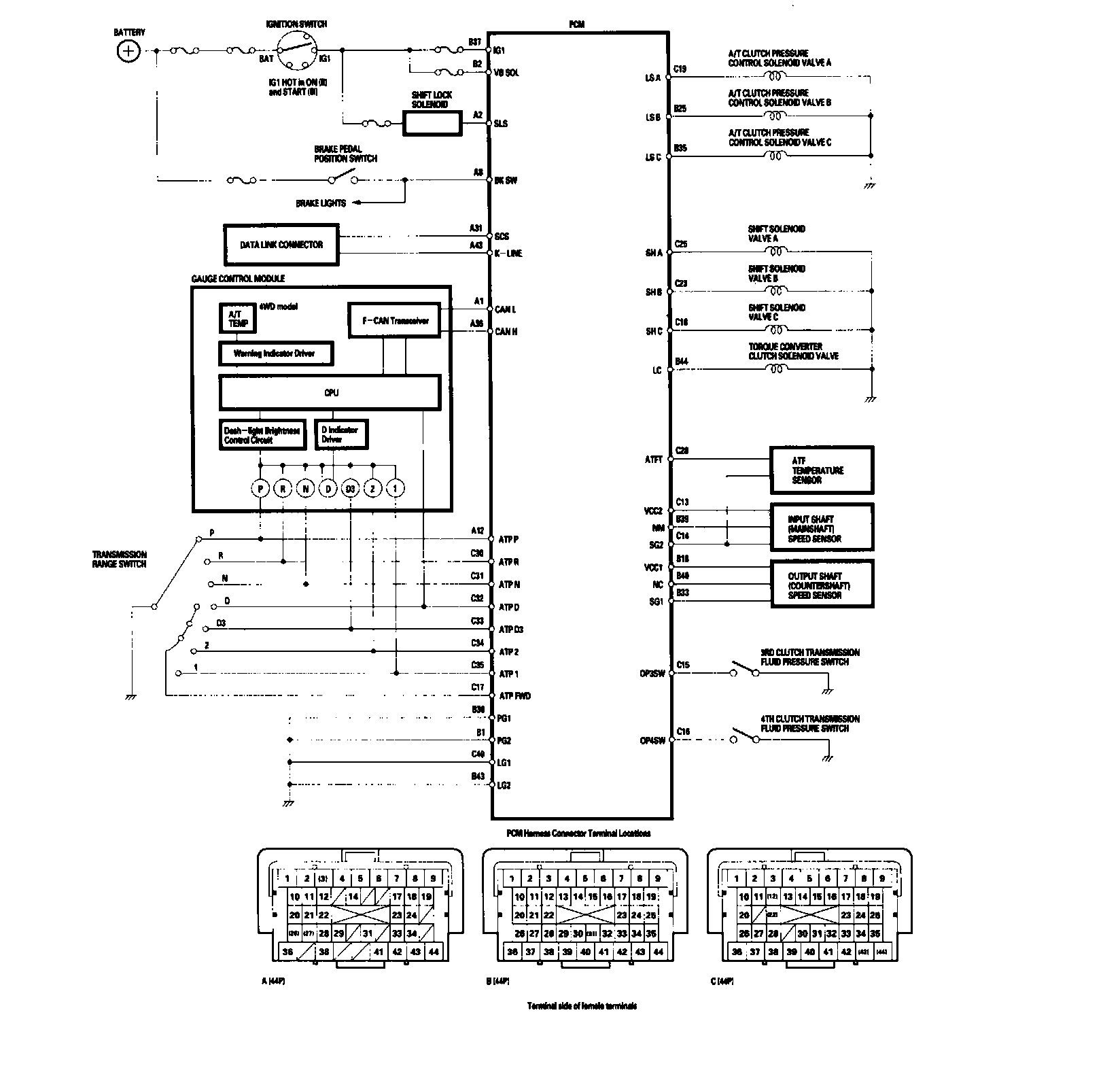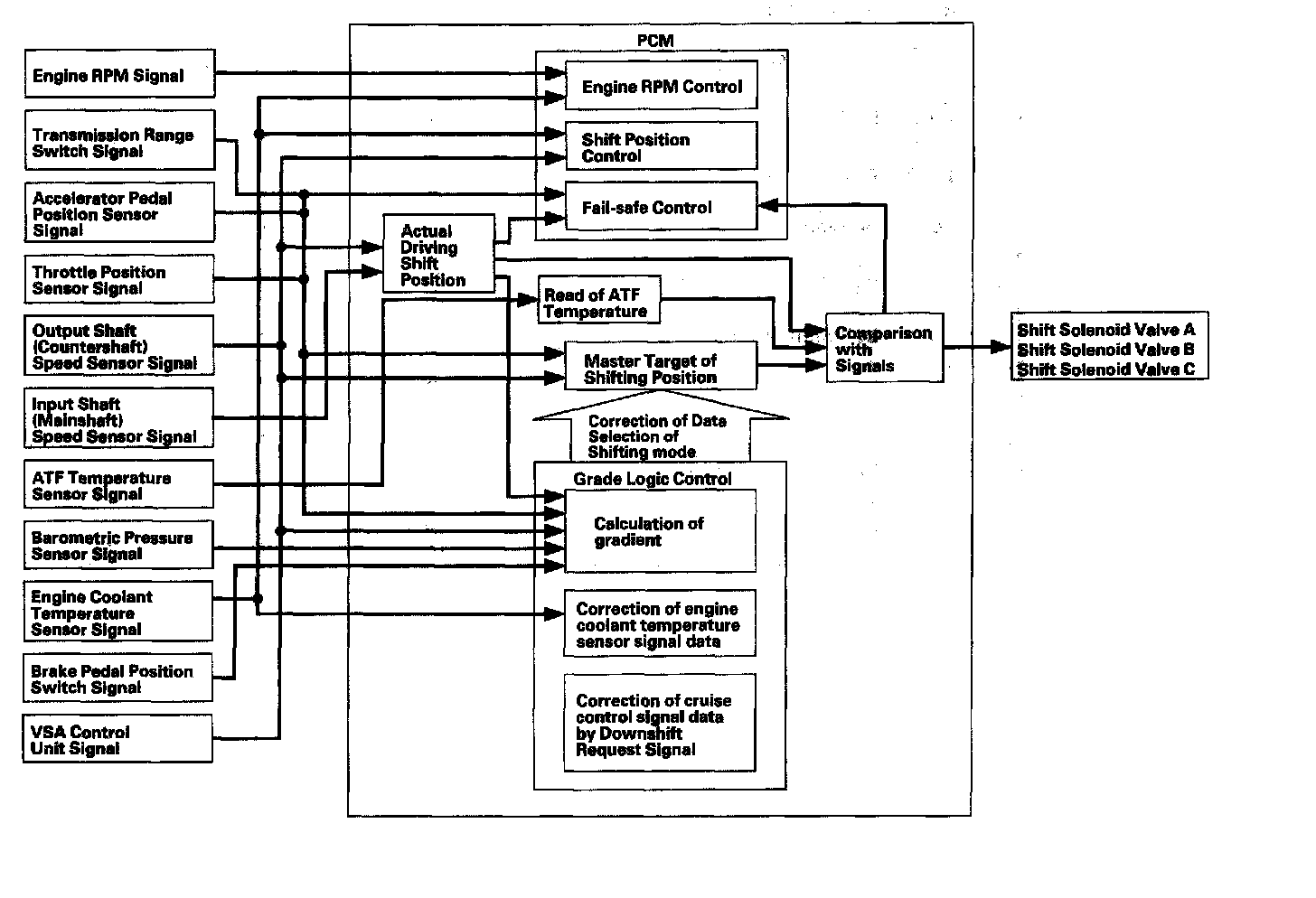 The PCM instantly determines which gear should be selected by various signals sent from sensors and switches, and it actuates the shift solenoid valves A, B, and C to control shifting transmission gear.
