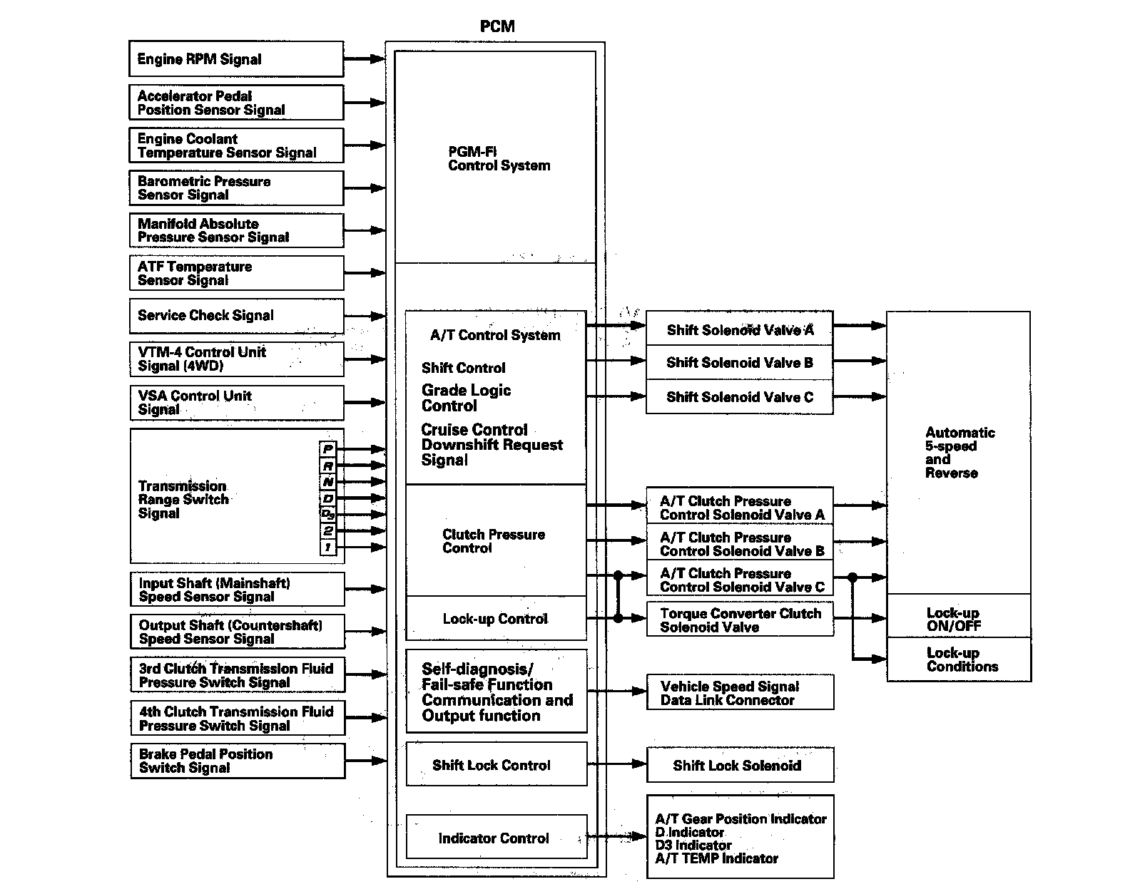 The PCM receives input signals from the sensors, switches, and other control units, processes data, and outputs signals for the engine control system and A/T control system. The A/T control system includes shift control, grade logic control, clutch pressure control, and lock-up control. The PCM switches the shift solenoid valves and the A/T clutch pressure control solenoid valves to control shifting transmission gears and lock-up torque converter clutch.