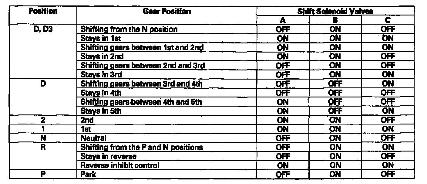 The combination of driving signals to shift solenoid valves A, B, and C are shown in the table.