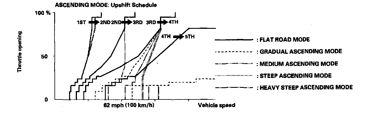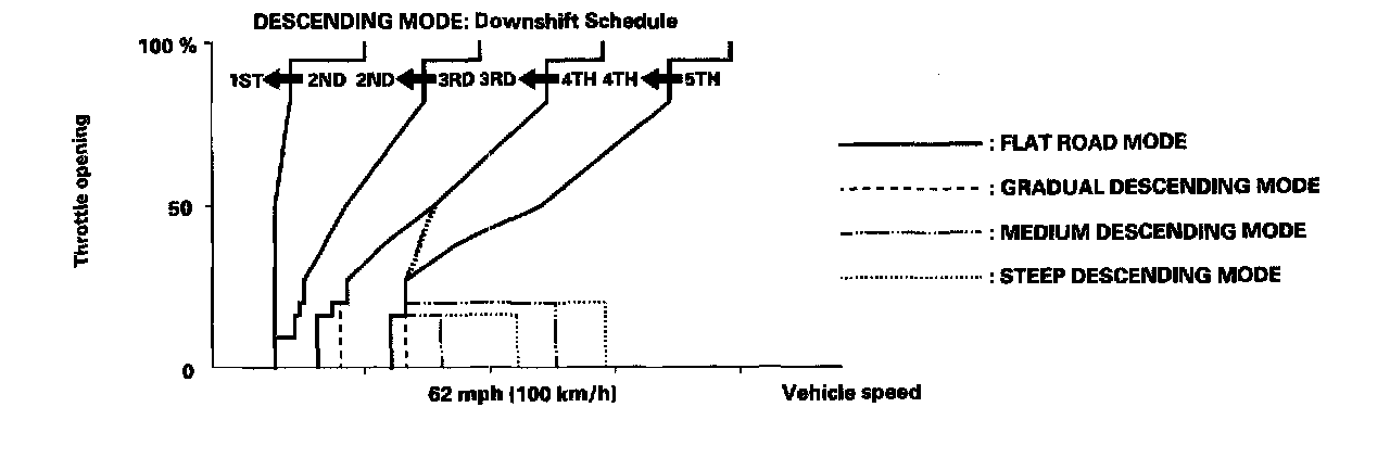 When the PCM determines that the vehicle is going down a hill in the D position, the shift-up speed from 4th to 5th gear, 3rd to 4th gear, and from 2nd to 3rd (when the throttle is closed) becomes faster than the set speed for flat road driving to widen the 4th gear, 3rd gear, and 2nd gear driving areas. This, in combination with engine braking from the deceleration lock-up, achieves smooth driving when the vehicle is descending. There are three descending modes with different 4th gear driving areas, 3rd gear driving areas and 2nd gear driving areas according to the magnitude of a gradient stored in the PCM. When the vehicle is in 5th or 4th gear and you are decelerating while applying the brakes on a steep hill, the transmission will downshift to a lower gear. When you accelerate, the transmission will then return to a higher gear.