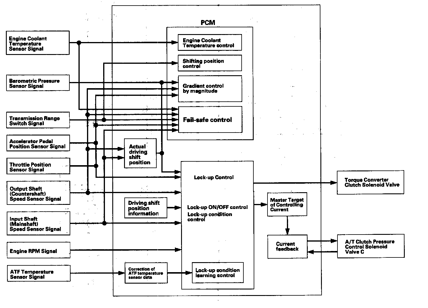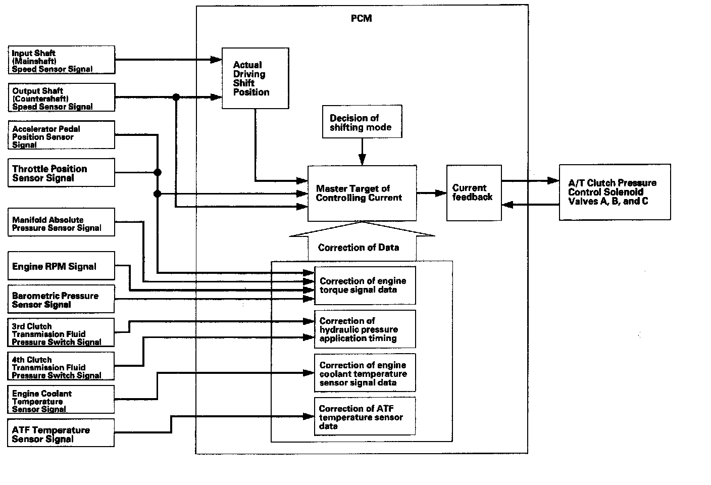 The PCM receives input signals from the various sensors and switches, performs processing data, and outputs a current to the A/T clutch pressure control solenoid valves A, B, and C.