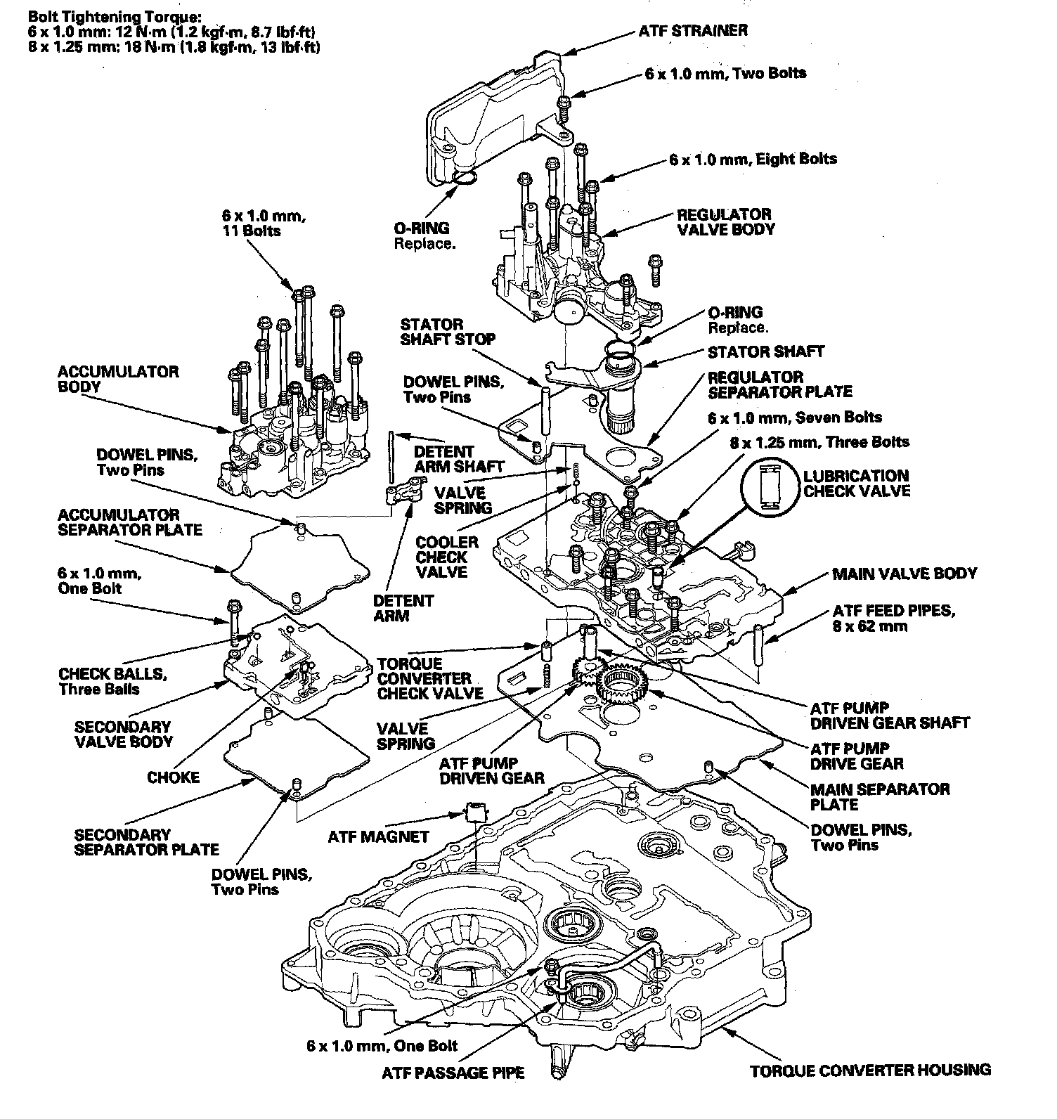 11. Install the 8 x 62 mm ATF feed pips in the main valve body, and install the accumulator body (11 bolts).