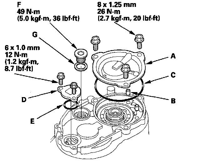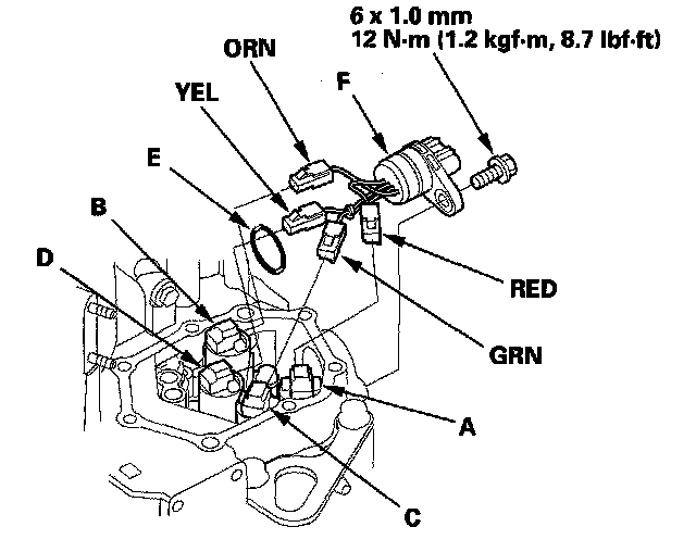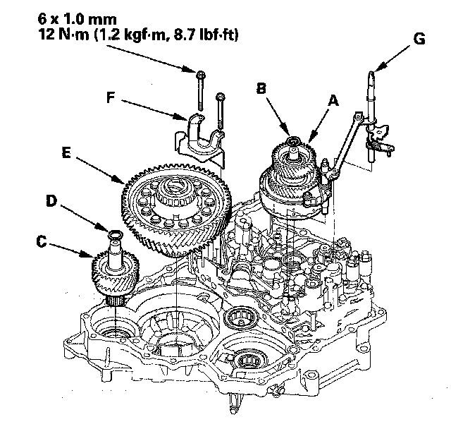 72. Install the connector bracket (F), and secure the ATF lines with the 6.6 mm bolts (G) on the transmission housing. Tighten the bolts to 12 Nm (1.2 kgf-m, 8.7 ft. lbs.).