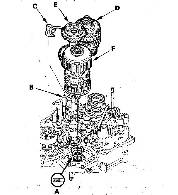 25. Engage the shift fork (C) with the reveres selector on the countershaft, and join the mainshaft (D), countershaft (E), and secondary shaft (F), then install them in the torque converter housing and shift fork on the shift fork shaft.