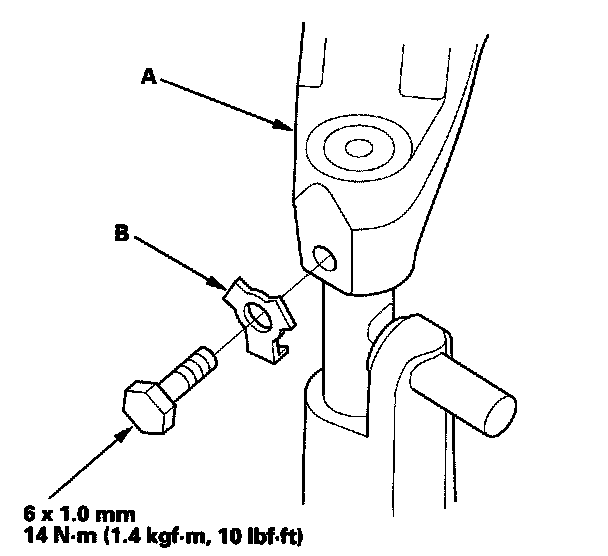 26. Secure the shift fork (A) to the shift fork shaft with the lock bolt and the new lock washer (B), then bend the lock tab of the lock washer against the bolt head.