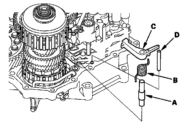 27. Install the park pawl shaft (A), pawl spring (B), park pawl (C), and park pawl stop (D).