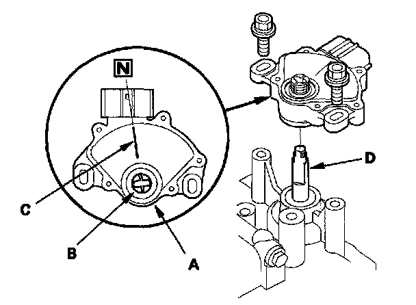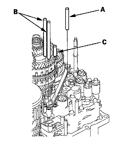 4. Install the main valve body (seven 6 mm bolt and three 8 mm bolts). Make sure the ATF pump drive gear (A) rotates smoothly in the normal operating direction, and the ATF pump driven gear shaft (C) moves smoothly in the axial and normal operating direction.