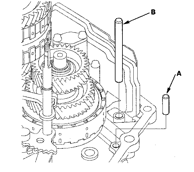 24. Turn the shift fork shaft (B) so the large chamfered hole is facing the fork bolt hole of the shift fork.