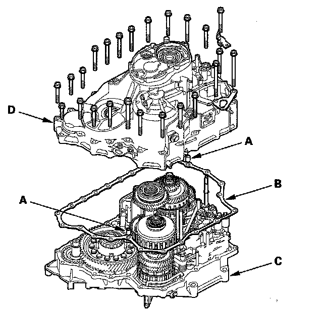 33. Place the transmission housing (D) on the torque converter housing.