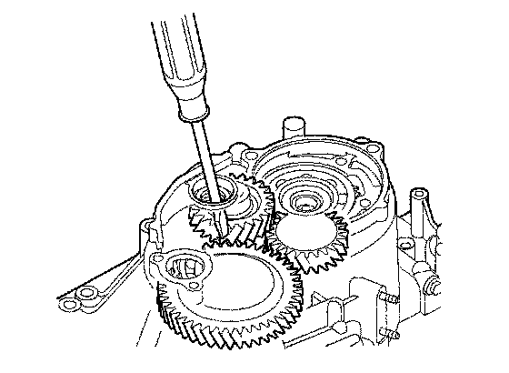 34. Wrap a screwdriver tip with tape to prevent damage to the reverse idler gear teeth. Engage the reverse idler gear with reverse gears by rotating the idler gear using the screwdriver.