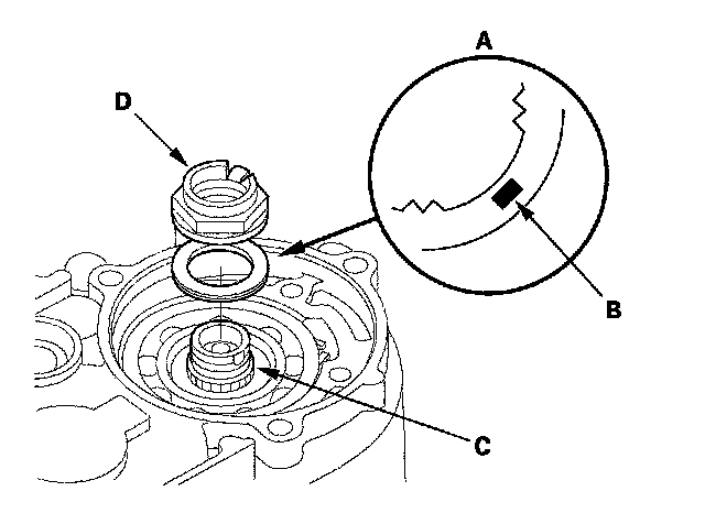 39. Install the new lock washer (A) with the marked side (B) up over the mainshaft (C), and apply the surfaces of the lock washer and old locknut (D) with ATF.