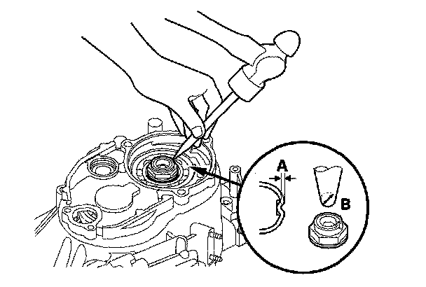 41. Install the new locknut and tighten it to 176 Nm (18.2 kgf-m, 132 ft. lbs.). then stake the locknut into its shaft in depth (A) of 0.7 - 1.3 mm (0.03 - 0.05 inch) using a 3.5 mm punch (B).