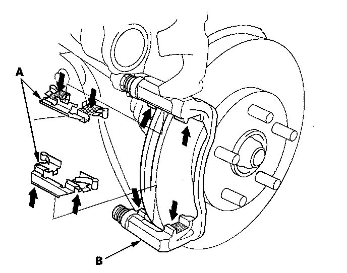 7. Clean the caliper bracket (B) thoroughly; remove any rust, and check for grooves and cracks.