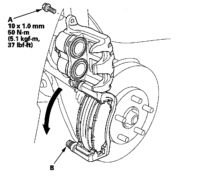 4. Remove the flange bolt (A) while holding the caliper pin (B) with a wrench. Be careful not to damage the pin boot, and pivot the caliper (C) up out of the way. Check the hose and pin boots for damage and deterioration.